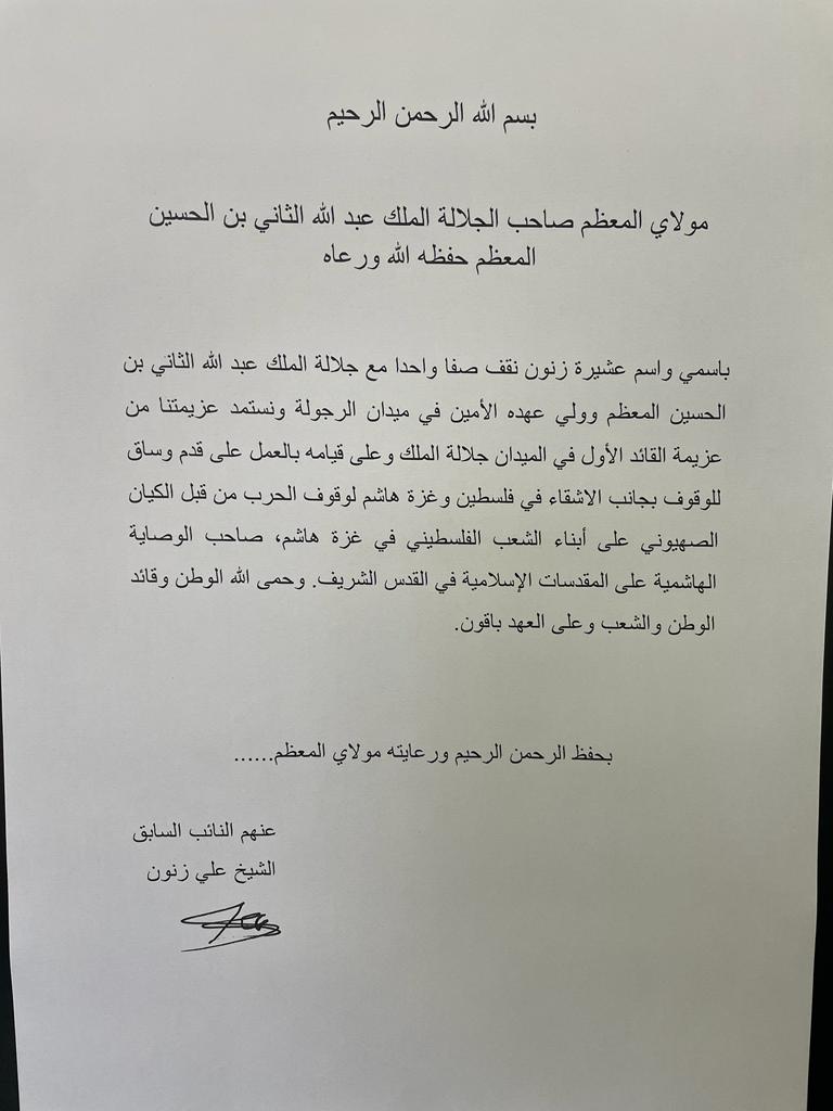 عشيرة زنون : نقف خلف جلالة المل وولي عهده صفاً واحداً ..