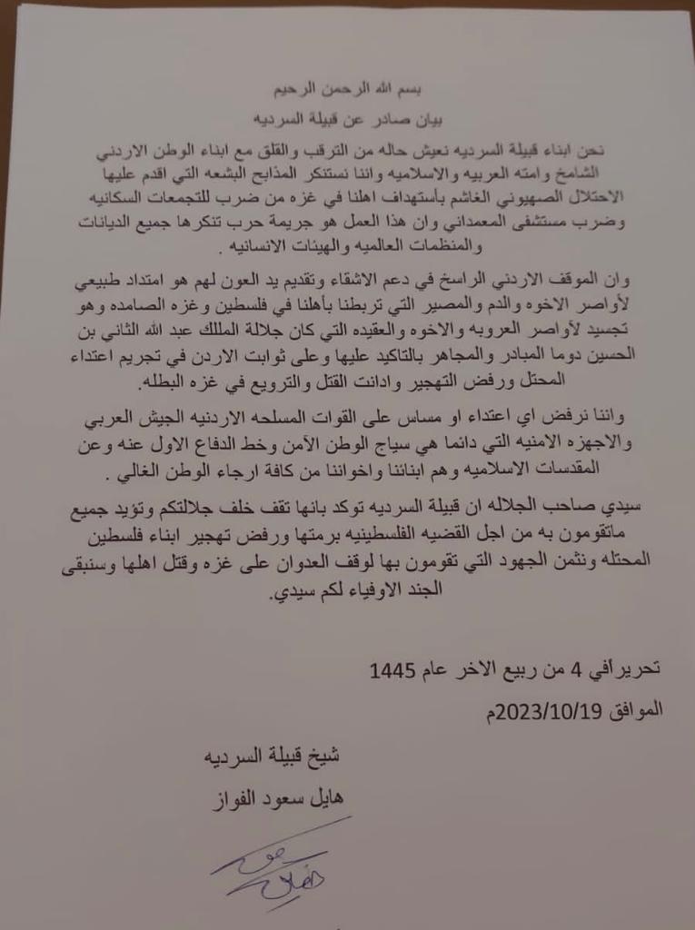 بيان صادر عن ابناء عشيرة المومني داخل اراضي المملكة الاردنية الهاشمية وخارجها