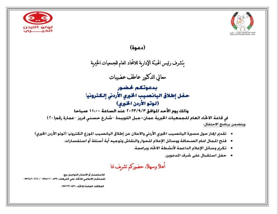 الاتحاد العام للجمعيات الخيرية يدعو لحفل اطلاق "لوتو الاردن الخيري" ويعمم نبذة عن اليانصيب الخيري الأردني ..