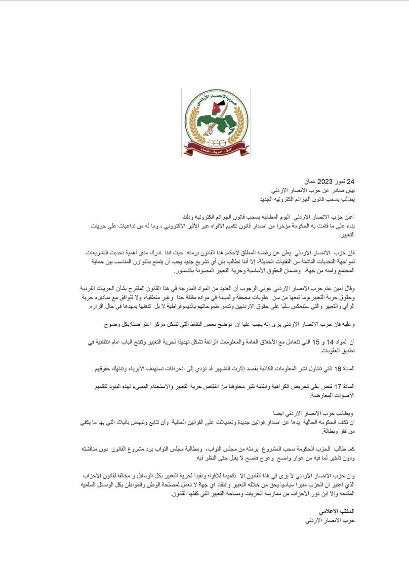 حزب الانصار الاردني يطالب بسحب قانون الجرائم الكترونيه ...