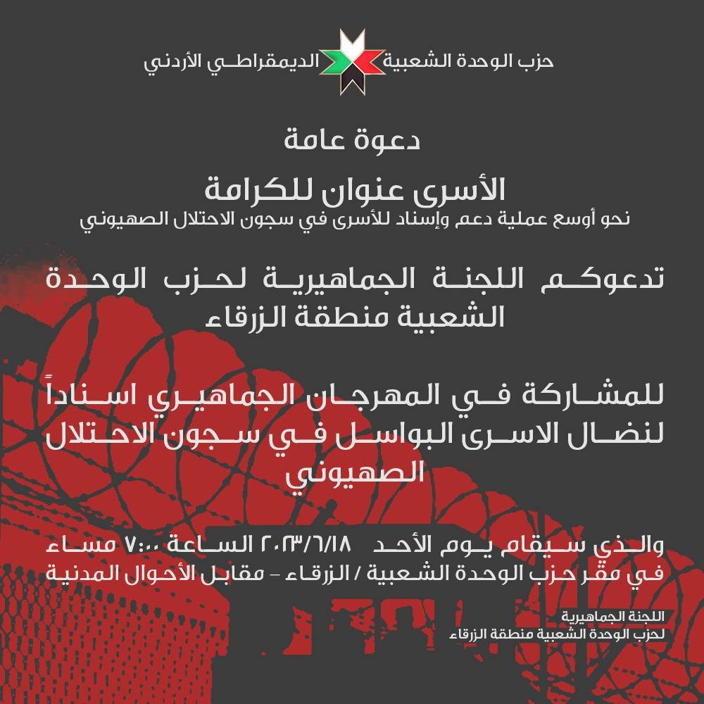 حزب الوحدة الشعبية يدعو لمهرجان جماهيري في الزرقاء اسناداً لنضال الاسرى البواسل في سجون الاحتلال الصهيوني