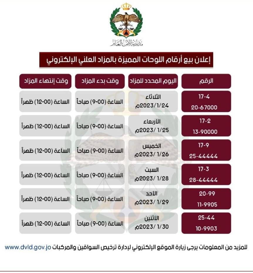 إدارة الترخيص تعلن بيع أرقام اللوحات المميزة بالمزاد العلني الالكتروني..