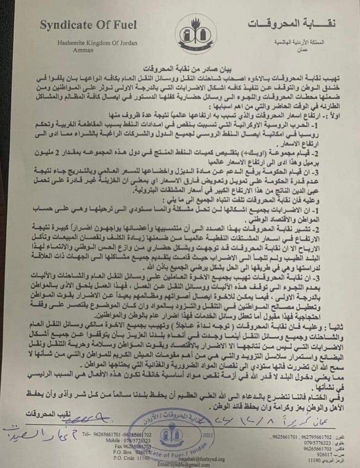 نقابة المحروقات تناشد مـالكي وسائل النقـل الـعـام والشاحنات بوقف الاضرابات وتؤكد .. ارتفاع المحروقات عالمي / (وثيقة)