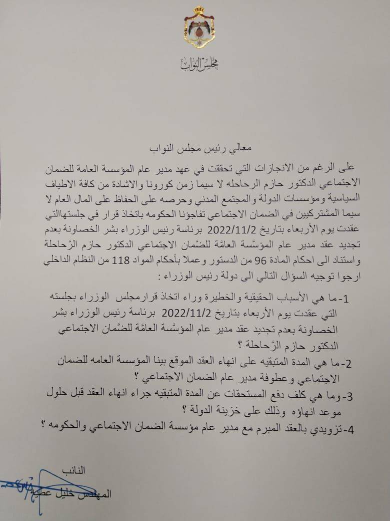 النائب خليل عطية يفتح النار على الحكومة ويمطرها بوابل من الاسئلة ويطلب عقد الرحاحلة ..