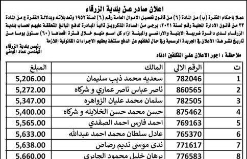 بلدية الزرقاء تتوعد المتخلفين عن دفع ضريبة المسقفات وتطالب بالتسديد الفوري