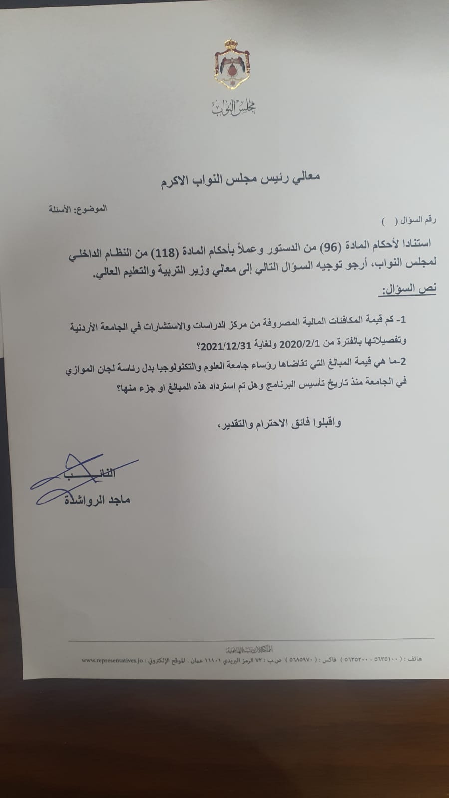 النائب الرواشدة يسأل الحكومة عن مكافات مركز الدراسات والاستشارات في الجامعة الأردنية..