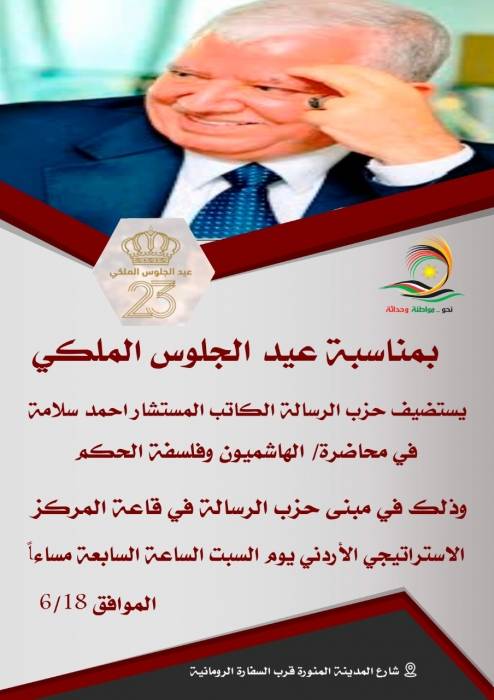 بأدارة د. رلى الحروب .. الكاتب احمد سلامه في حزب الرسالة في محاضرة مهمة عن (الهاشميون وفلسفة الحكم)