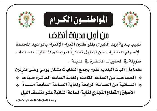 بلدية اربد للمواطنين : اليكم ساعات القاء النفايات