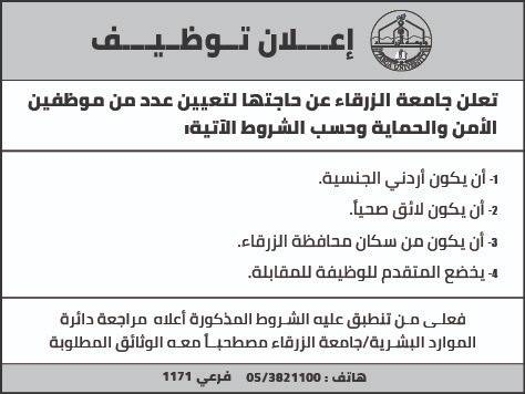 جامعة الزرقاء تعلن عن حاجتها لموظفين أمن وحماية..
