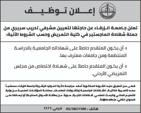 جامعة الزرقاء تعلن عن حاجتها لتعيين مشرفين..