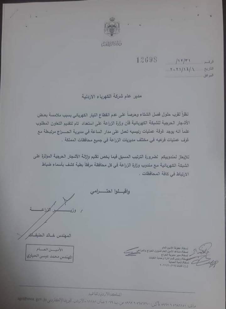 شركة الكهرباء الأردنية لم تتعاون مع وزارة الزراعة بإزالة وتقليم الأشجار الحرجية المؤثرة على الشبكة الكهربائية (وثيقة)