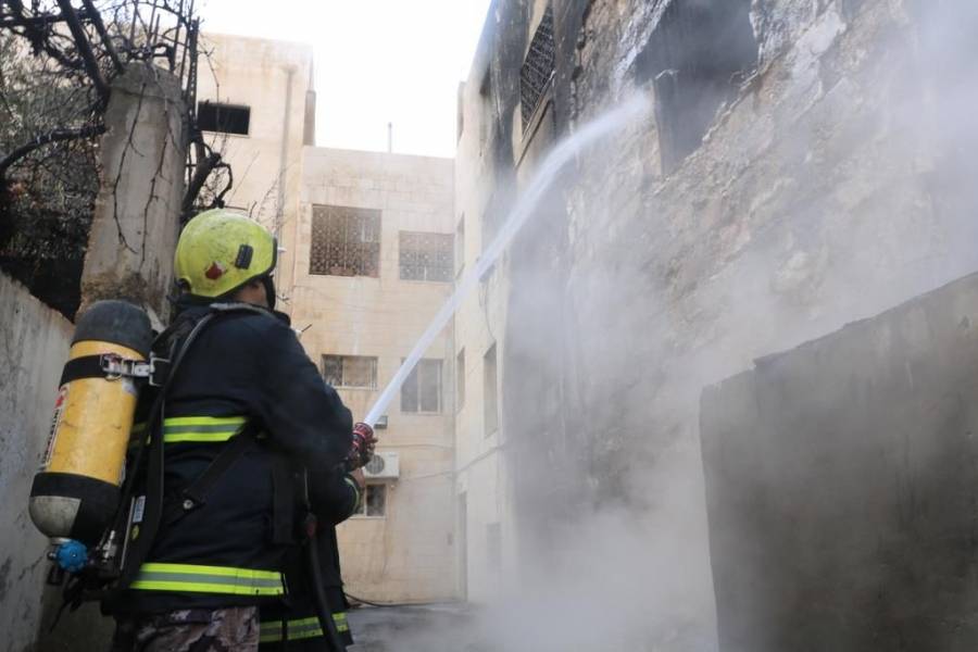 الدفاع المدني يتعامل الآن مع حريق مستودع مواد بناء وبولسترين في منطقة خلدا..