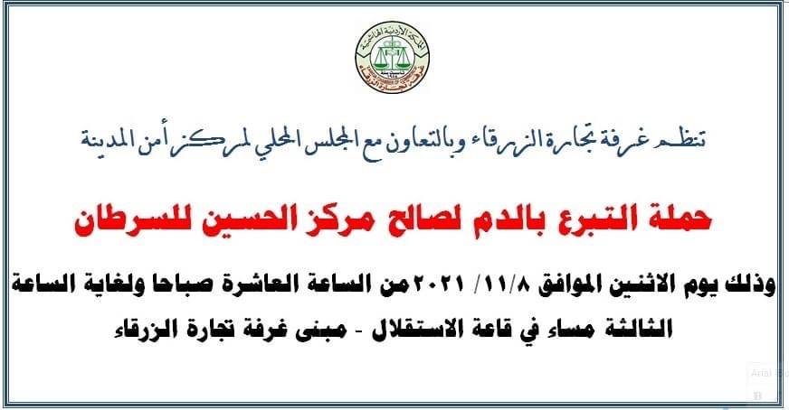 غرفة تجارة الزرقاء تنظم حملة للتبرع بالدم لصالح مركز الحسين للسرطان غداً الاثنين ..