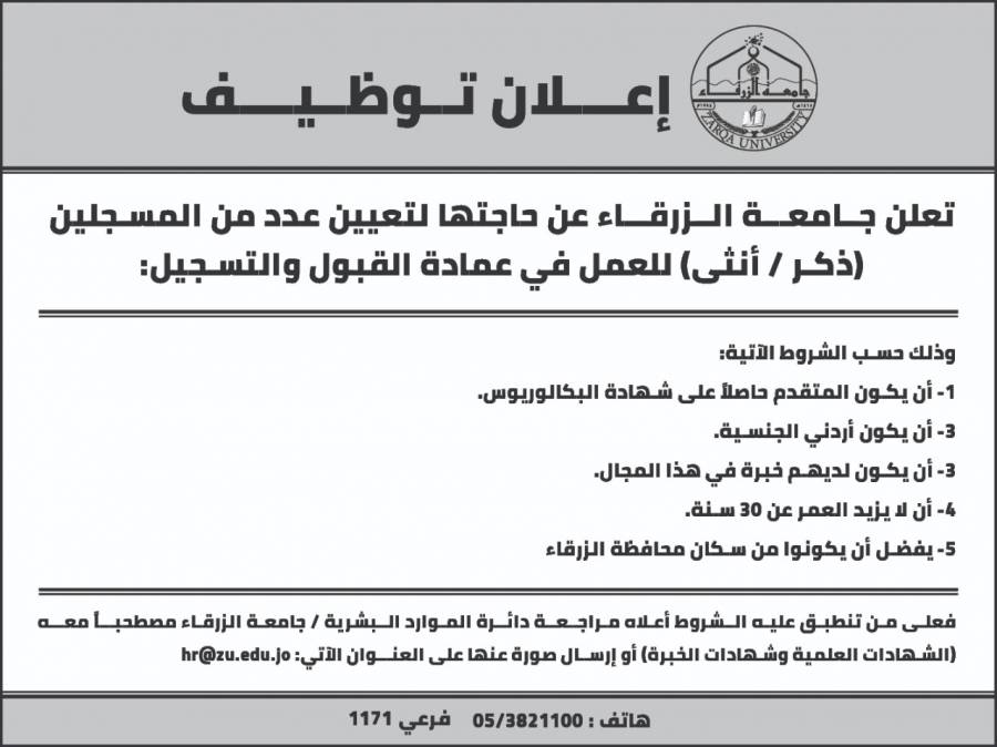 جامعة الزرقاء الخاصة : إعــلان تـوظـيــف