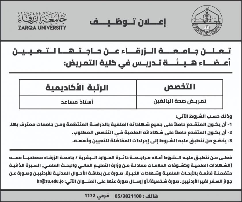 جامعة الزرقاء الخاصة : إعـــلان تــوظــيــــف..