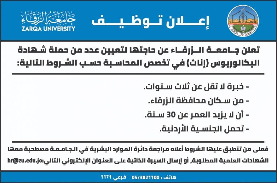 اعلان توظيف تعلن جــامعـة الــزرقـاء عن حاجتها لتعيين عدد من حملة شهادة البكالوريوس (إناث)..
