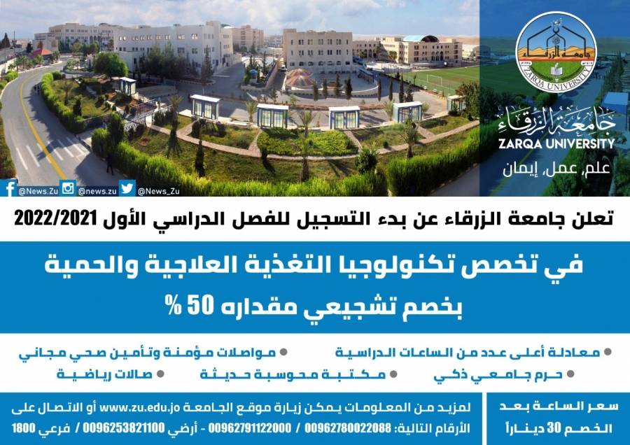 جامعة الزرقاء الخاصة : استحداث تخصص تكنولوجيا التغذية العلاجية والحمية..