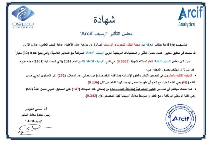 مجلة البلقاء في عمان الأهلية ضمن الفئة الأولى (Q1) بتخصصات الآداب والعلوم الإنسانية عربياً وفق تصنيف "أرسيف" 2024