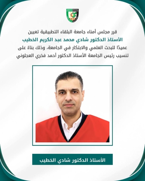 مجلس أمناء جامعة البلقاء التطبيقية يعيّن الدكتور شادي الخطيب عميدًا للبحث العلمي والابتكار