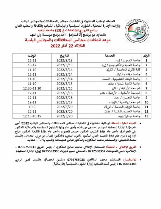 لقاءان حواريان للتشجيع على الانتخابات مع طلبة جامعتي اليرموك والتكنولوجيا غداً الأحد