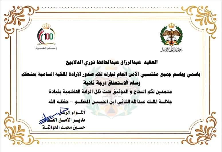 منح الدكتور العقيد عبد الرزاق الدلابيح وسام الاستحقاق الملكي