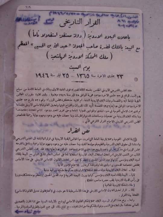وثيقة اعلان إستقلال المملكة الأردنية الهاشمية (وثيقة تاريخية)