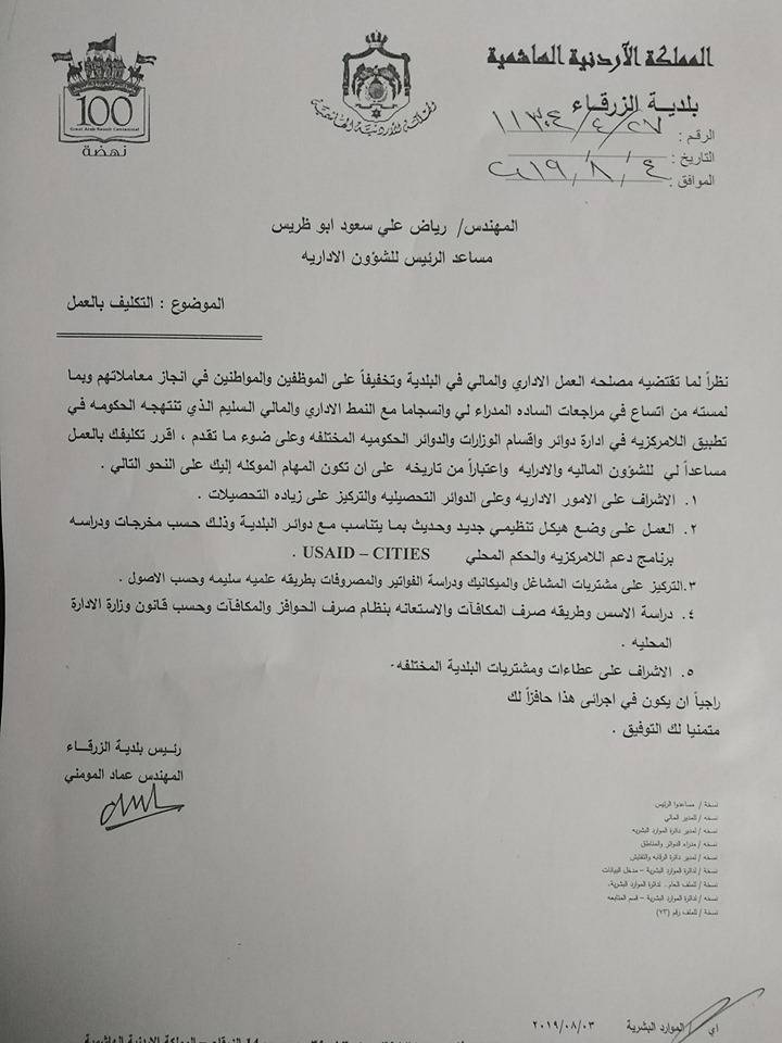 رياض ابو ظريس مساعدا" لرئيس بلدية الزرقاء للشؤون الأدارية