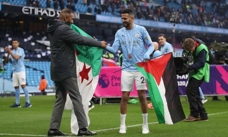 رياض محرز يرفع علم فلسطين أثناء الاحتفال بالتتويج بلقب الدوري الإنكليزي