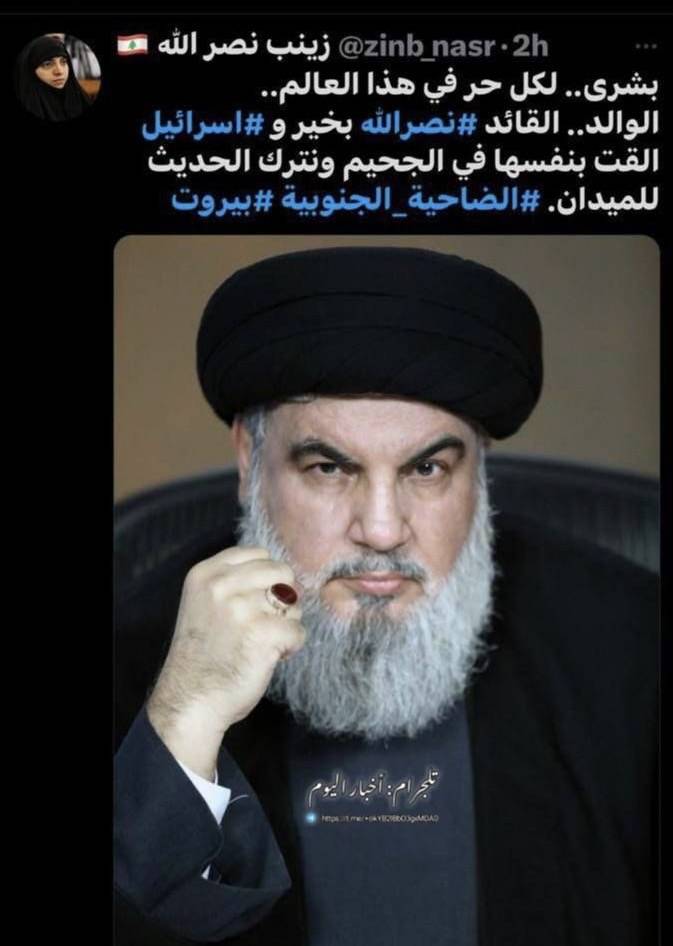 زينب ابنة حسن نصر الله : الوالد بخير واسرائيل القت بنفسها في الجحيم