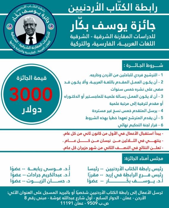 رابطة الكتّاب الأردنيين تطلق جائزة يوسف بكار للدراسات الشرقية - الشرقية المقارنة.