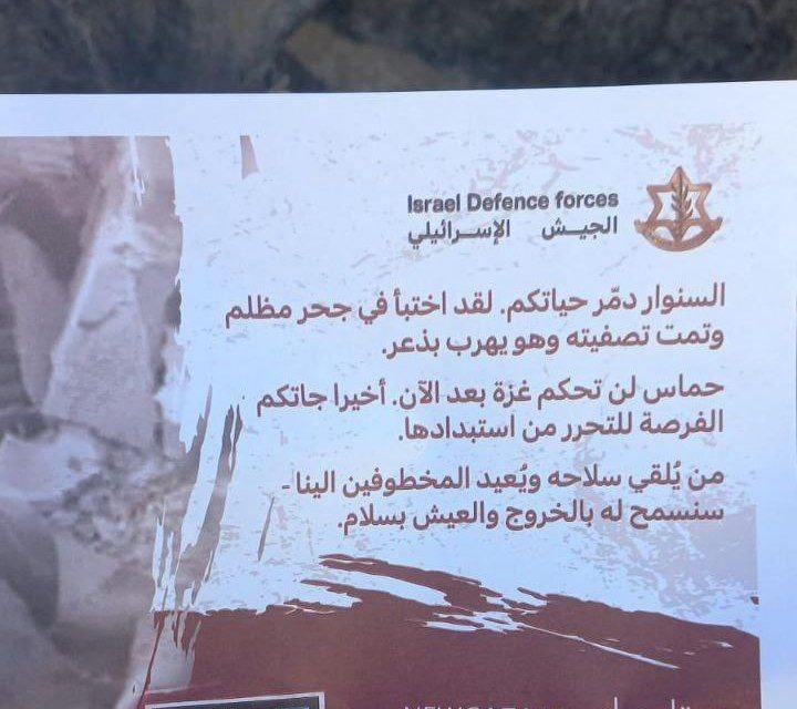 الاحتلال يسقط منشورات على غزة فيها صورة جثة السنوار