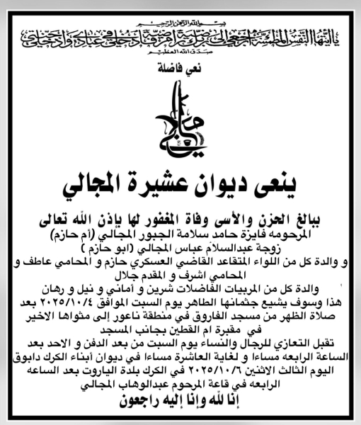 والدة الباشا حازم عبد السلام المجالي في ذمة الله..(تفاصيل)