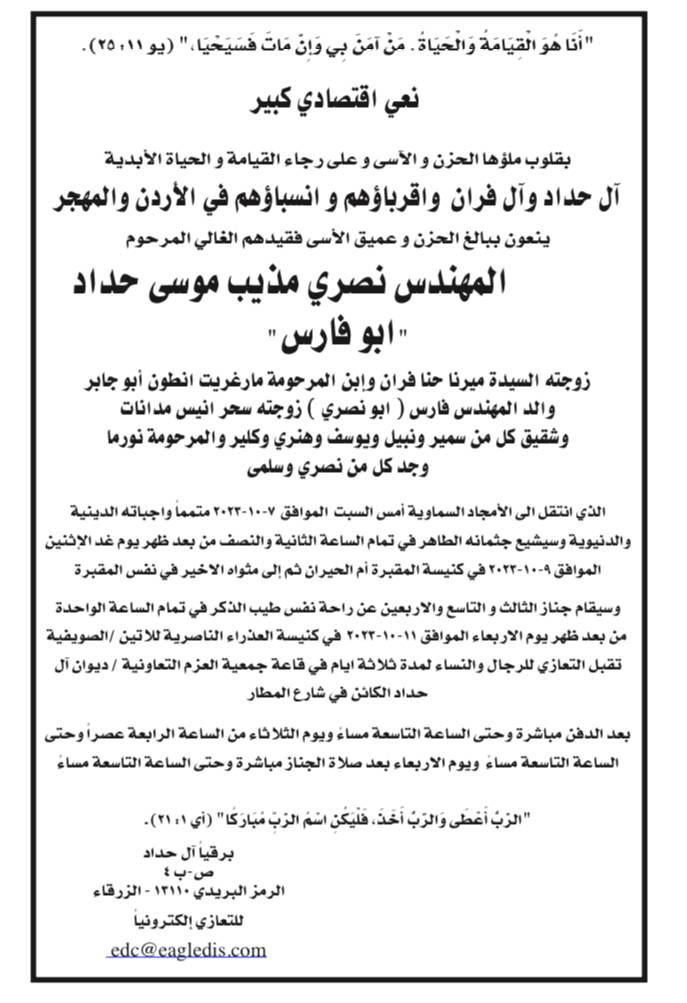 آل حداد وآل فران وغرفة صناعة الزرقاء ينعون الاقتصادي م. نصري حداد ..