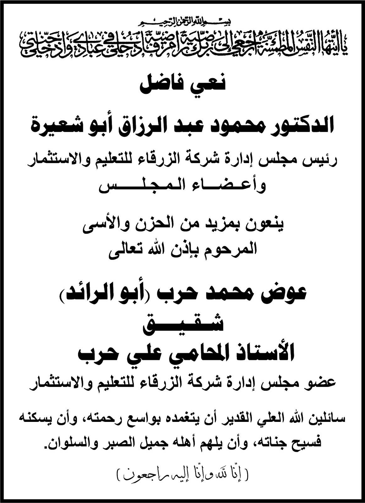 الدكتور محمود أبو شعيرة ينعى شـقـيـــق الأستاذ المحامي علي حرب..