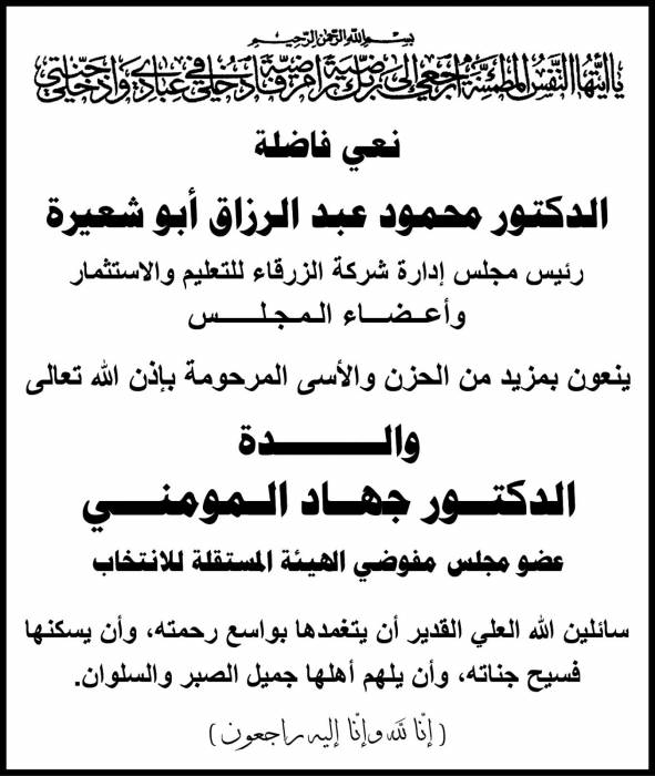 الدكتور محمود أبو شعيرة ينعى والدة الدكتور جهاد المومني..