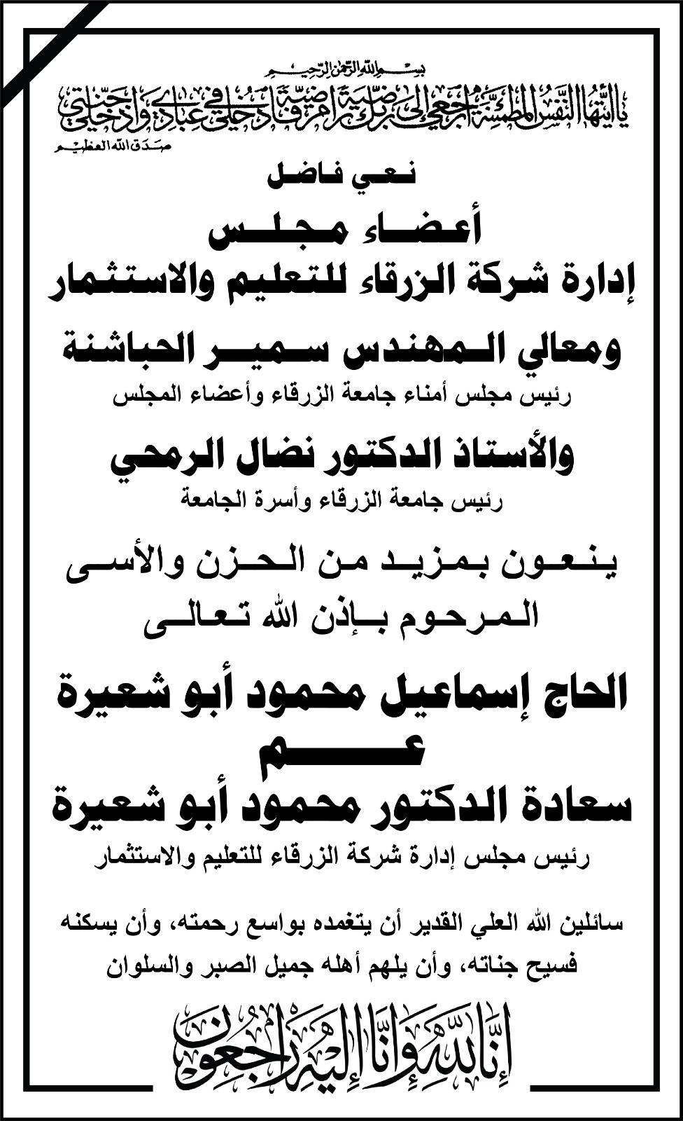 جامعة الزرقاء تنعى عم سعادة الدكتور محمود أبو شعيرة..