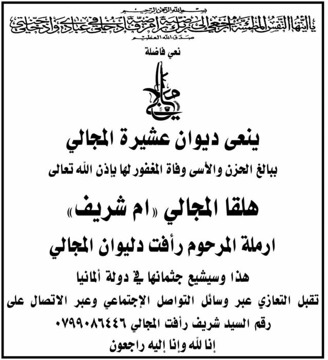 زوجة رئيس بلدية الزرقاء الأسبق رأفت ادليوان المجالي في ذمة الله..