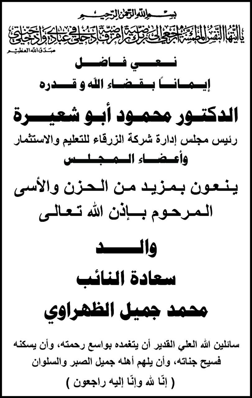 الدكتور محمود أبو شعيرة ينعى والد النائب محمد الظهراوي