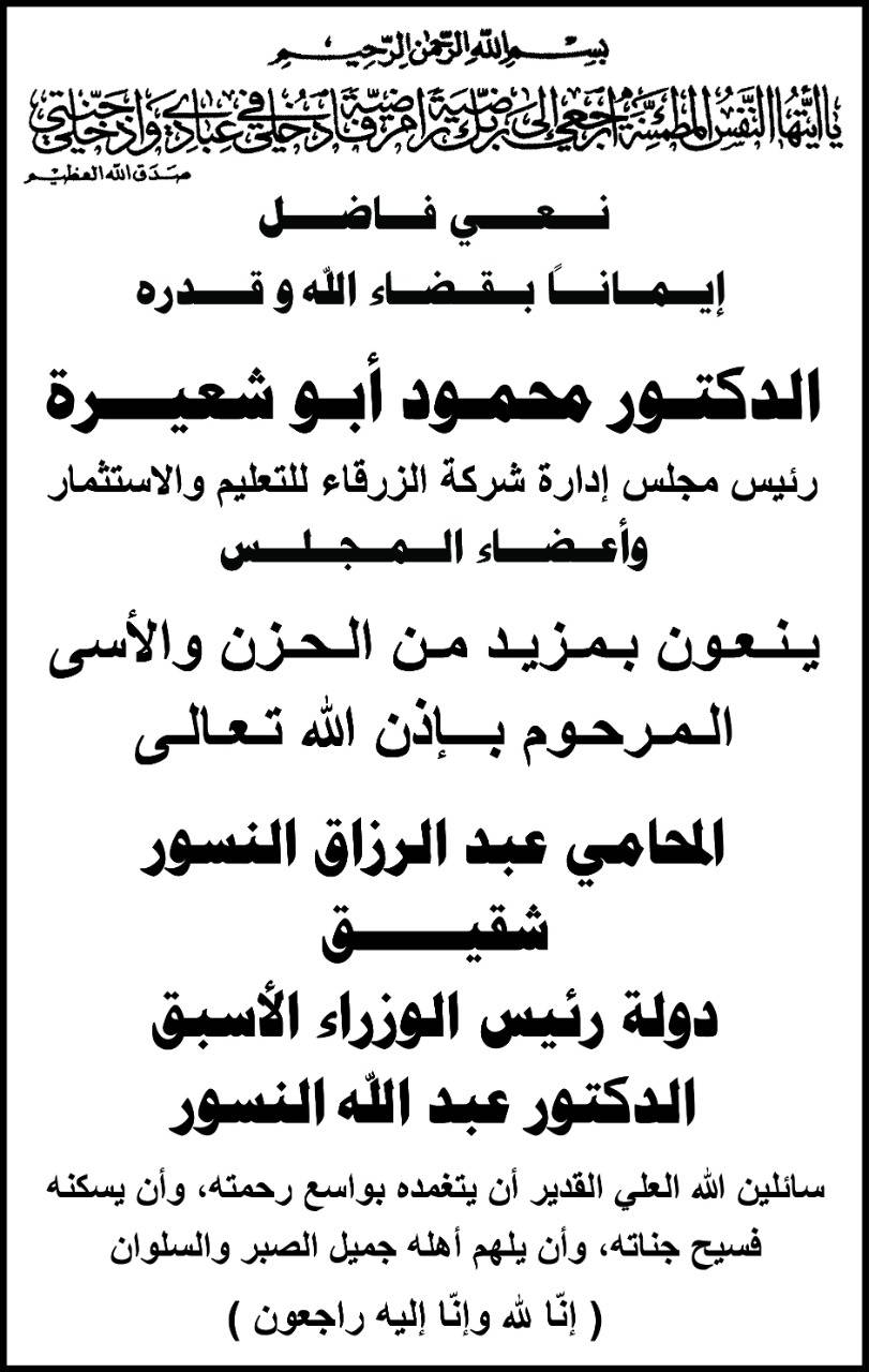 الدكتور محمود أبو شعيرة ينعى شقيق دولة الدكتور عبدالله النسور..
