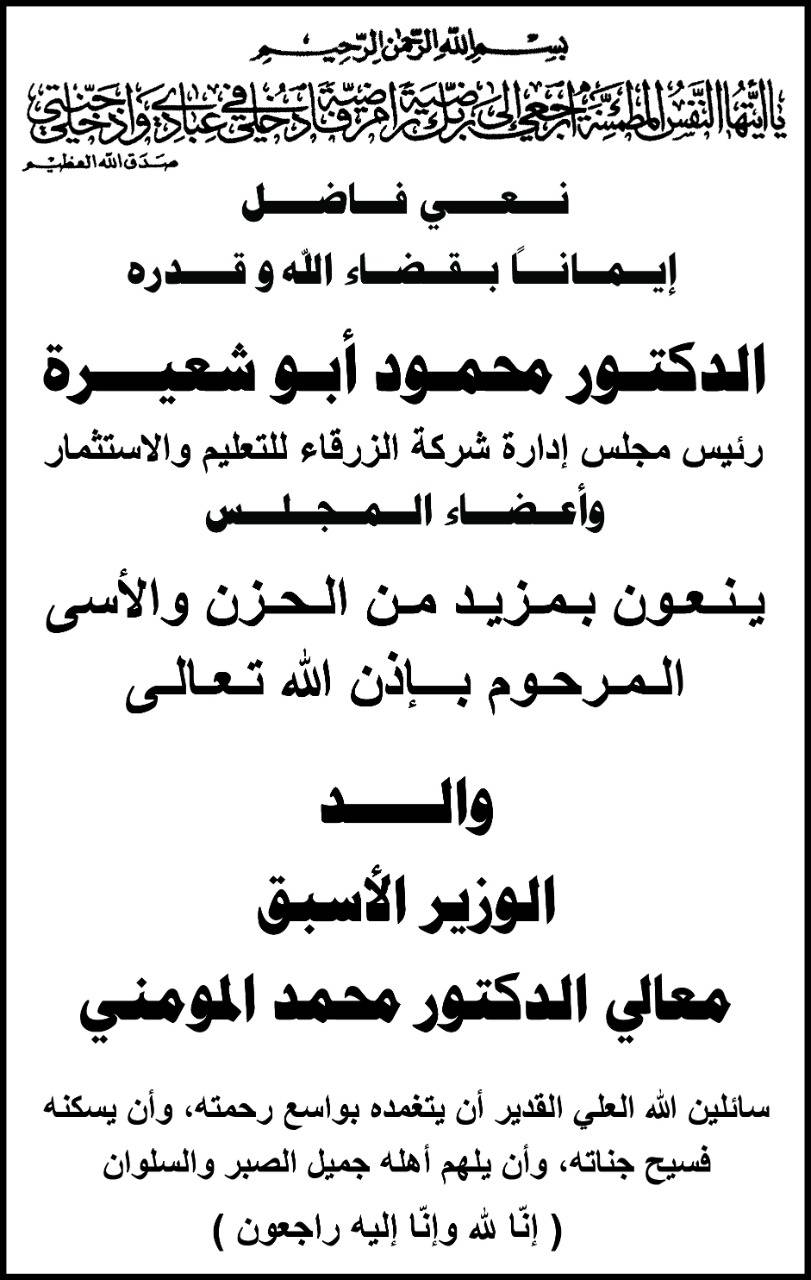 الدكتور محمود أبو شعيرة ينعى والد معالي الدكتور محمد المومني..