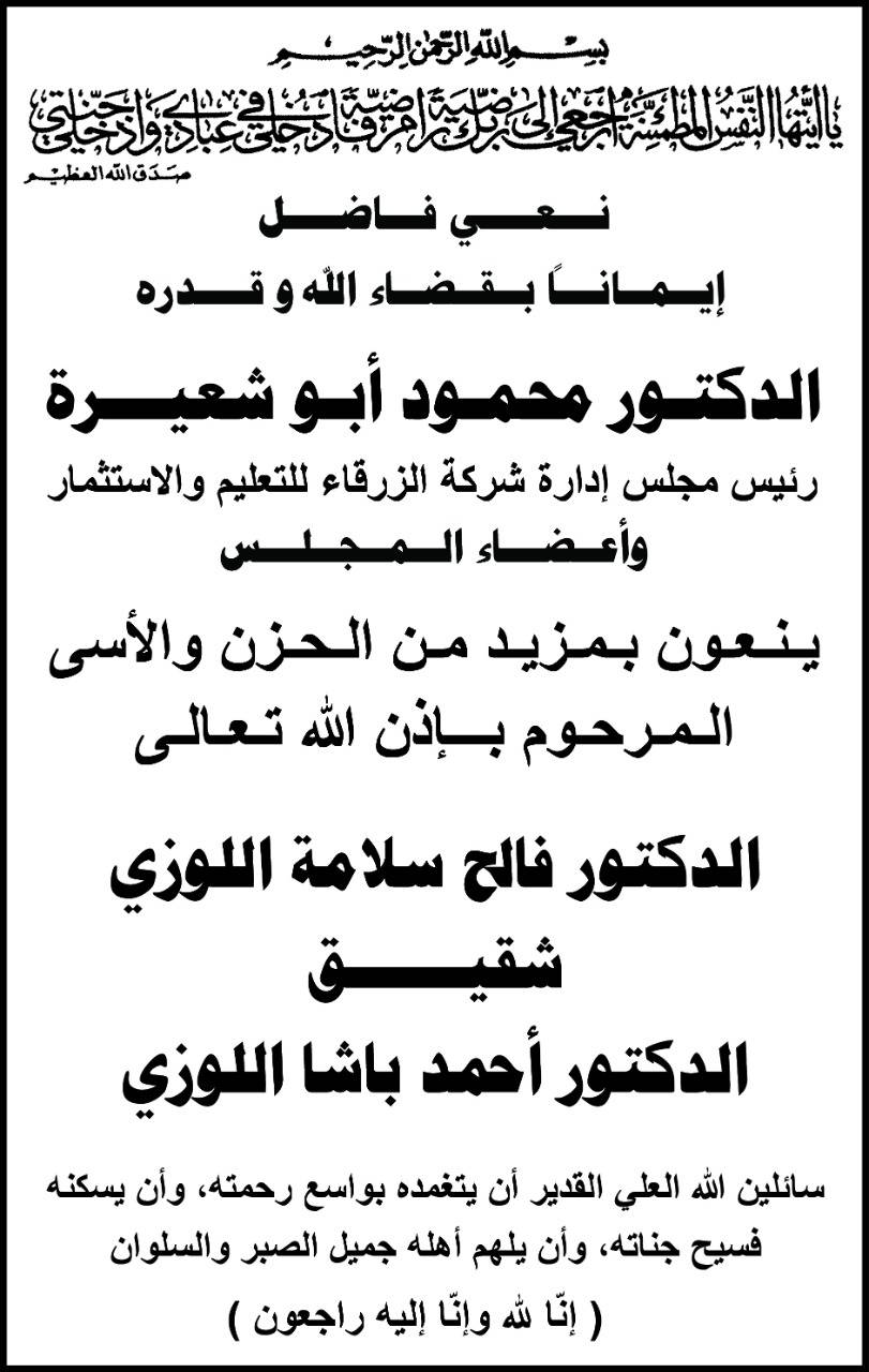 الدكتور محمود أبو شعيرة ينعى شقيق الدكتور أحمد باشا اللوزي..