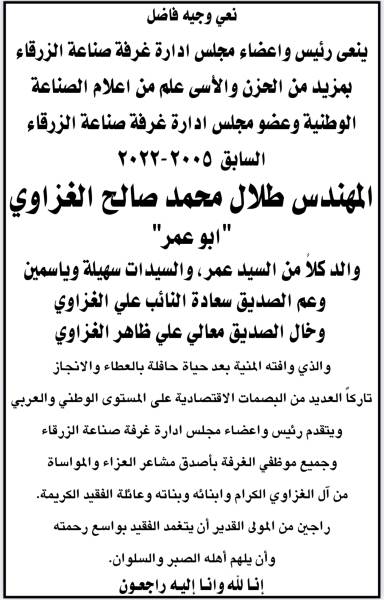 غرفة صناعة الزرقاء تنعى الاقتصادي م. طلال الغزاوي ..