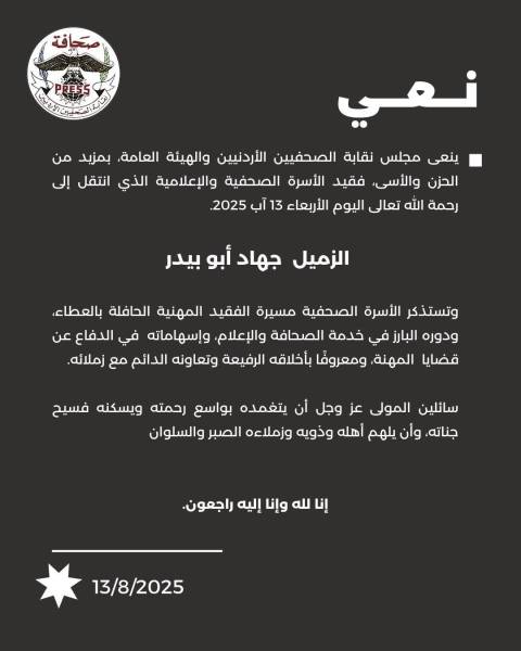مجلس نقابة الصحفيين الأردنيين والهيئة العامة تنعى فقيدالاسره الصحفيه والاعلاميه الزميل جهاد أبو بيدر