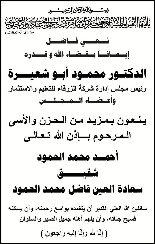 الدكتور محمود أبو شعيرة ينعى شقيق العين فاضل الحمود..