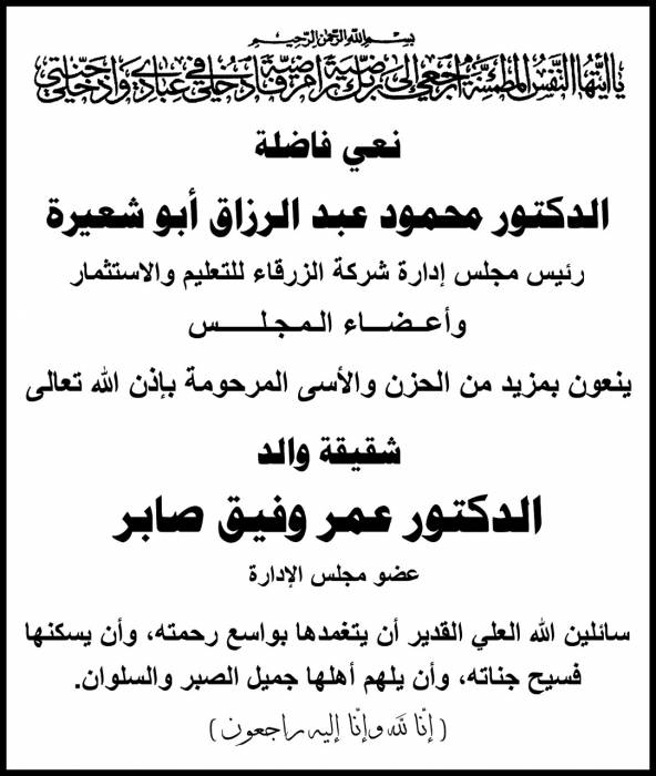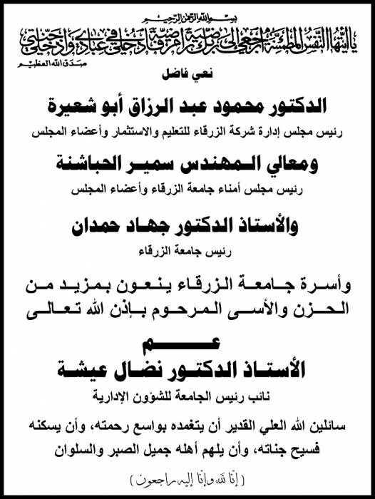 جامعة الزرقاء الخاصة تنعى "عمة" الدكتور عمر وفيق صابر ..