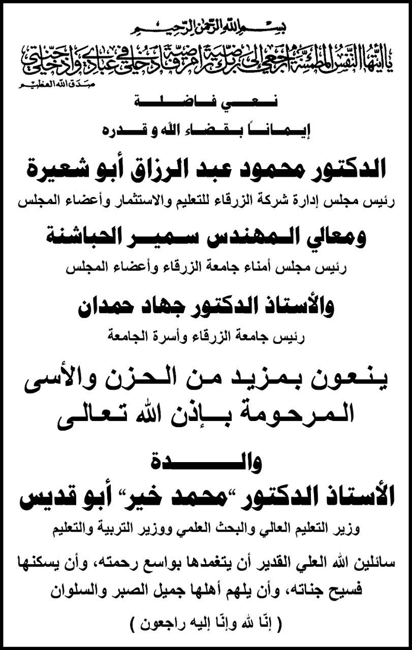 جامعة الزرقاء الخاصة تنعى والدة الأستاذ الدكتور "محمد خير" أبو قديس