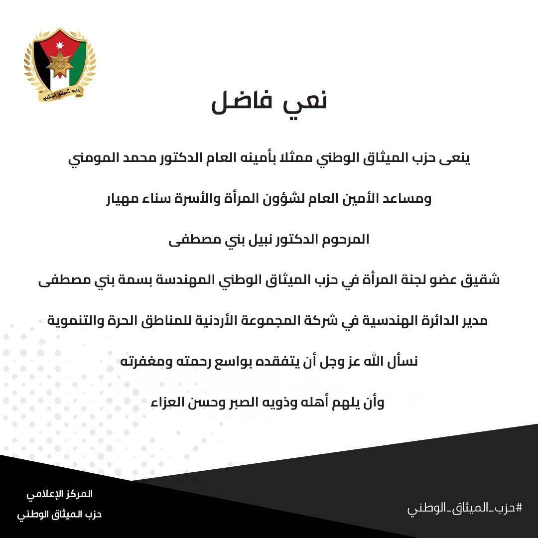 حزب الميثاق الوطني ينعى شقيق عضو لجنة المرأة "بسمة بني مصطفى" ..