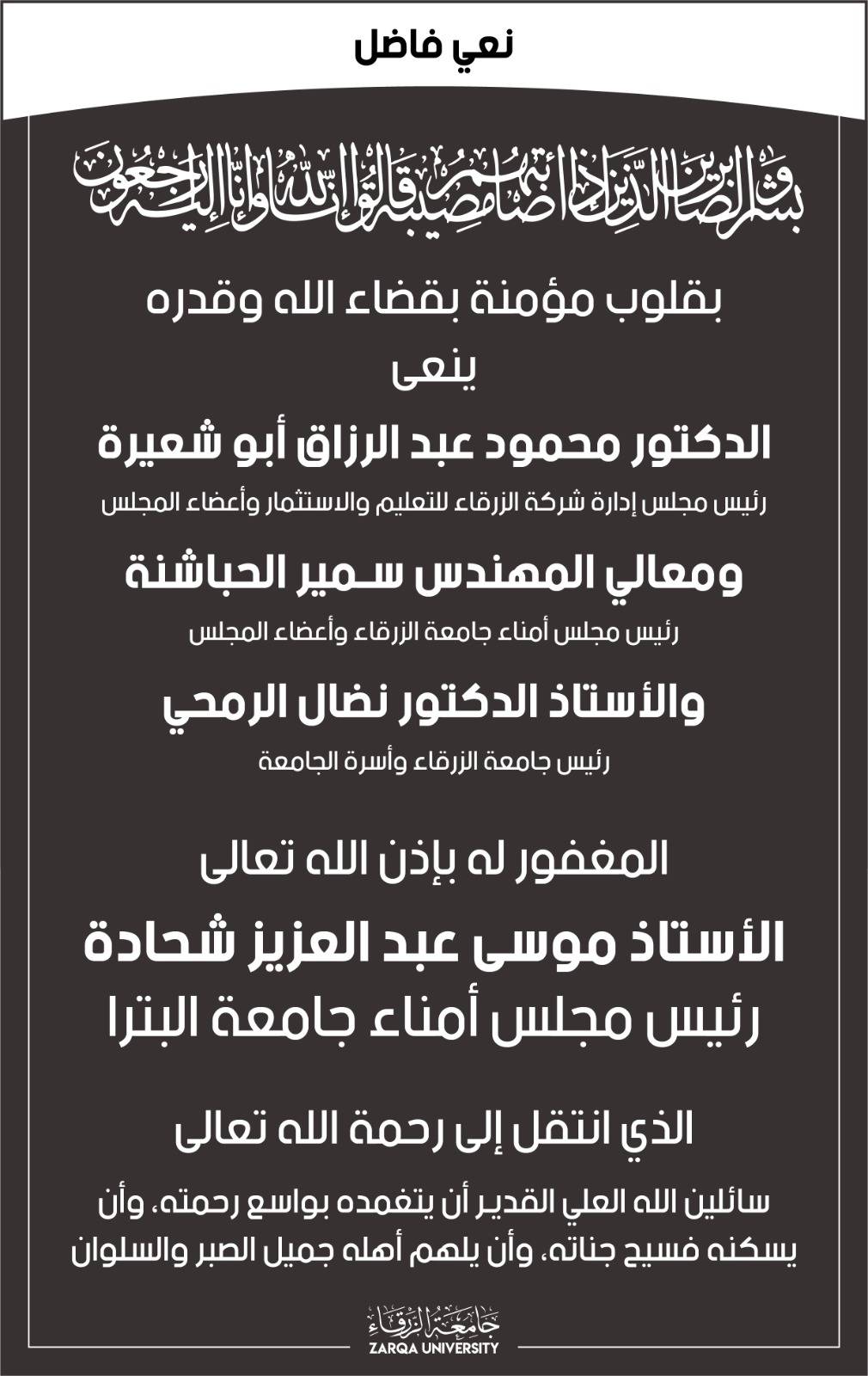 الدكتور محمود أبو شعيرة ينعى الأستاذ موسى شحادة..