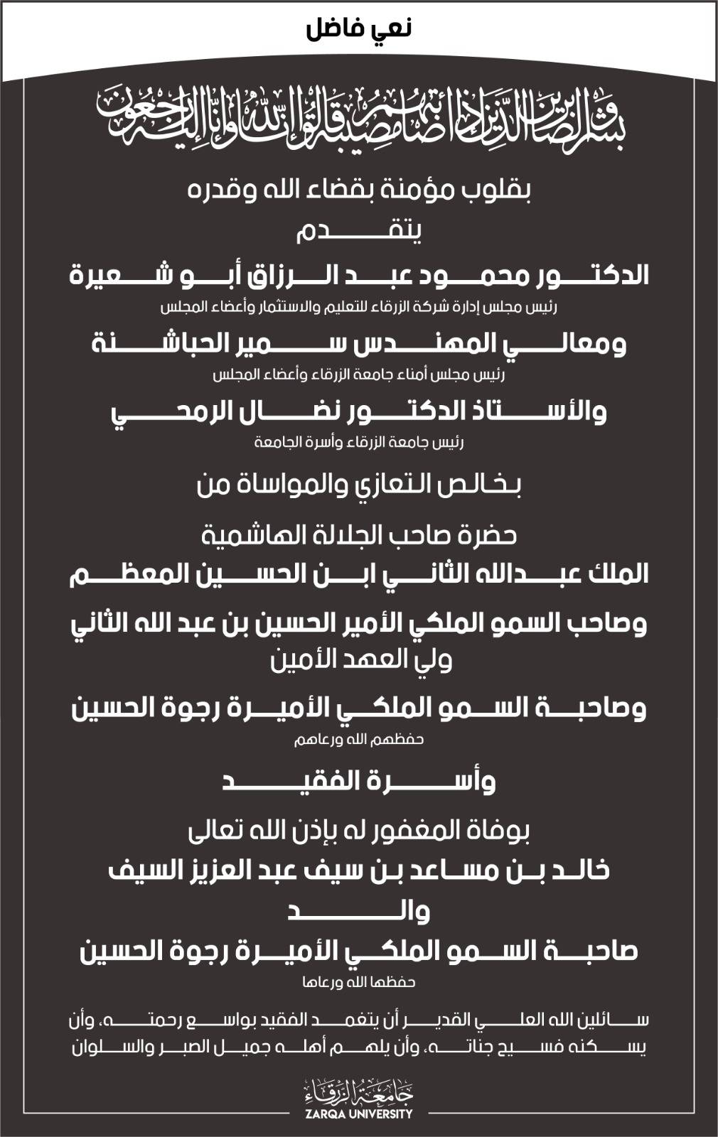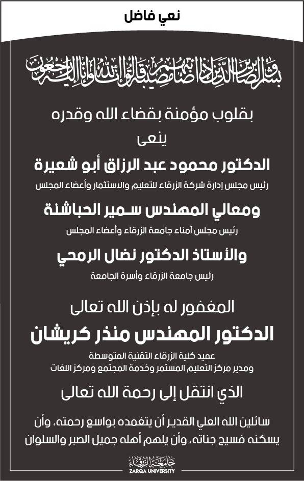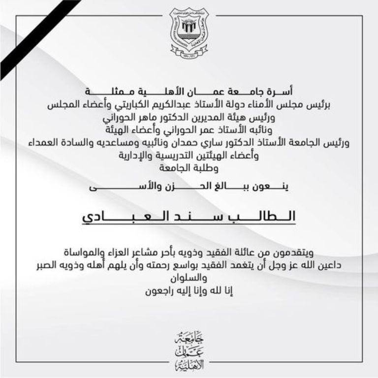 أسرة جامعة عمان الأهلية تنعي طالبها المرحوم سند العبادي