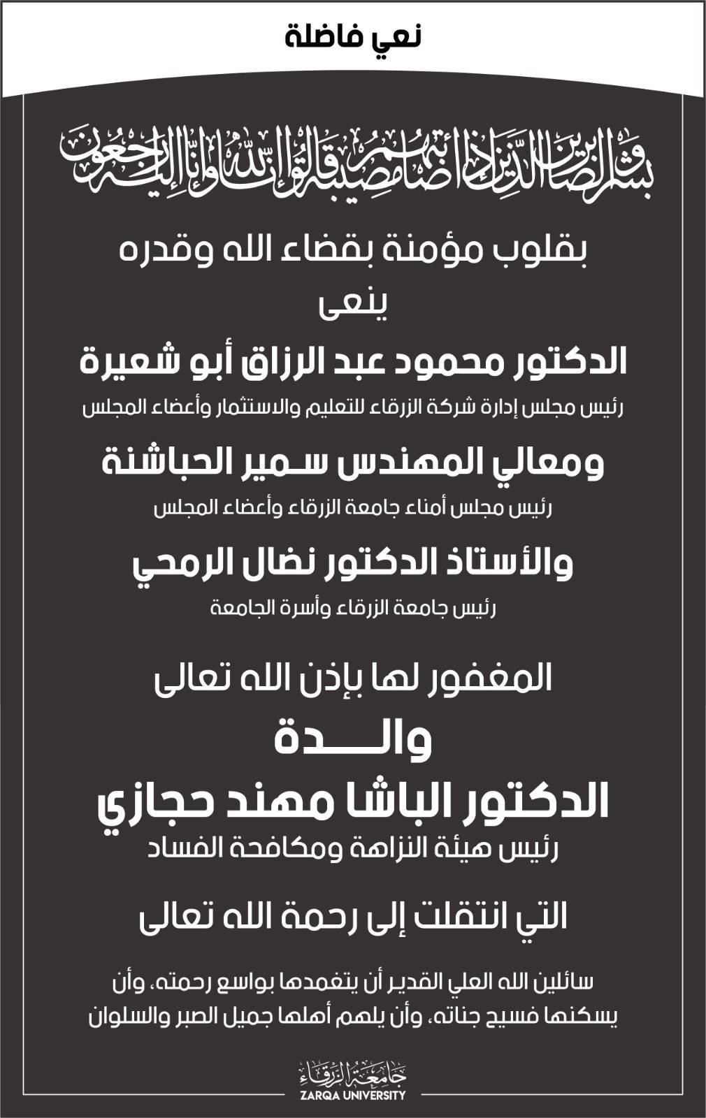 والدة رئيس هيئة النزاهة ومكافحة الفساد مهند حجازي في ذمة الله..